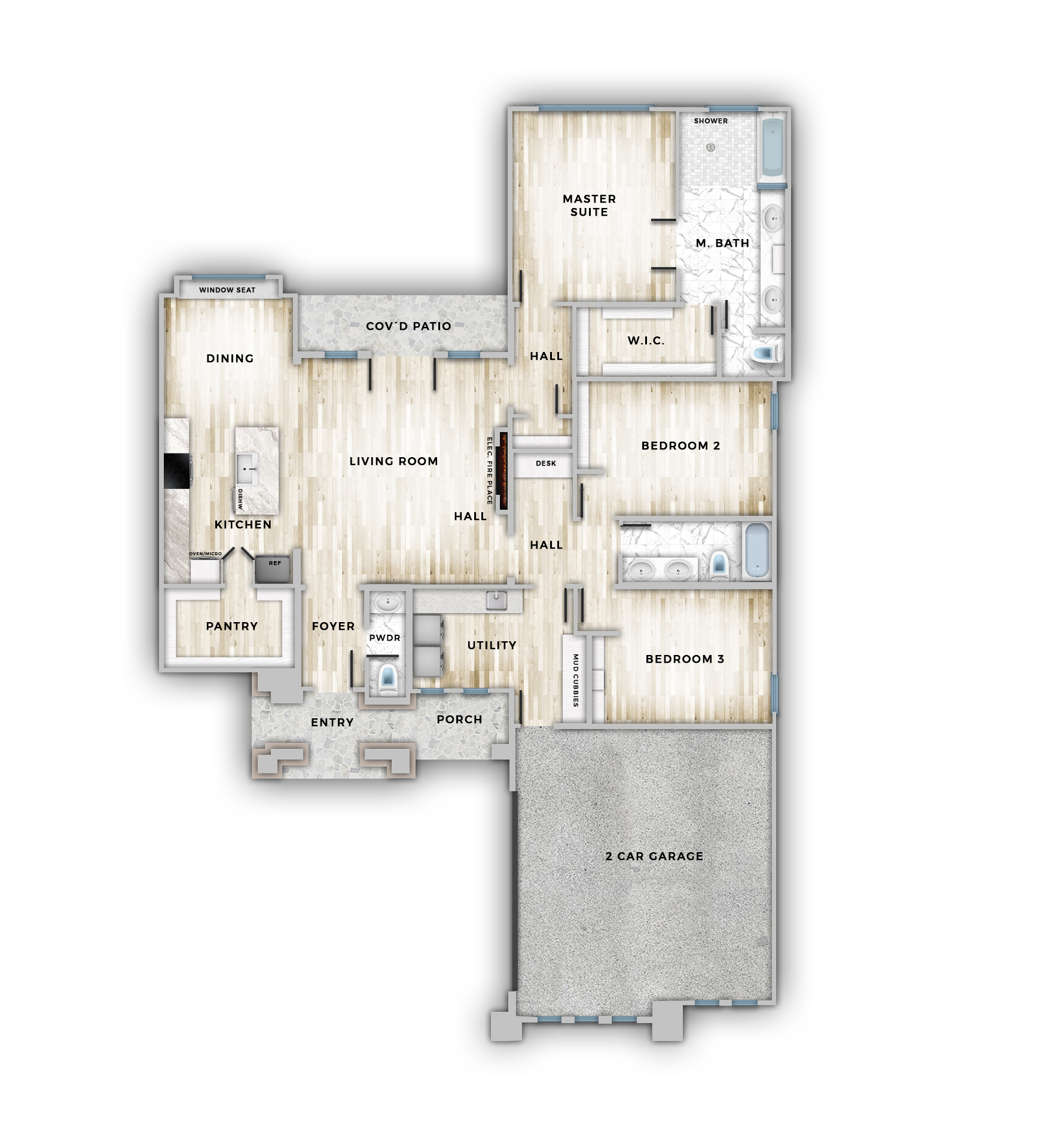 - Main living area ceiling height: 12'-0"